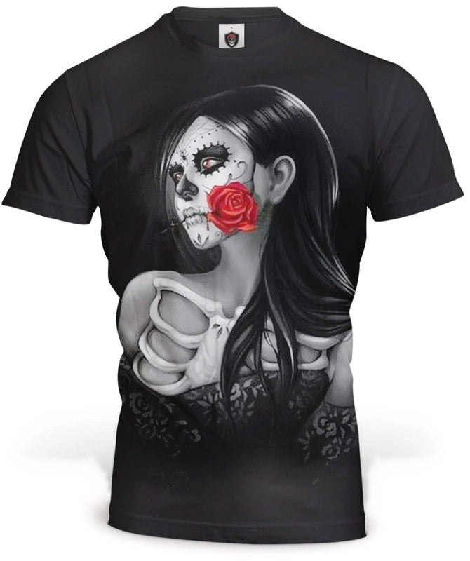 Diz-se que esta linda mulher foi abandonada há muito tempo. Ela tem um olhar em branco, virada para o horizonte. Faça companhia à Catrina Mexicana Skull T-Shirt!