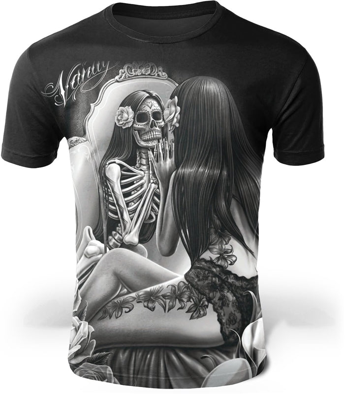 Beleza é ilusória e temporária pois os efeitos da passagem do tempo são inevitáveis. Aproveite ao máximo cada segundo com esta camiseta esqueleto preta e branca ideal para o Halloween ou para uma roupa casual escura!